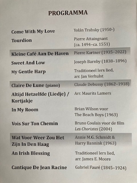 Voor de gelegenheid hadden we een paar oude, bekende Nederlandstalige liederen in het programma opgenomen en het publiek reageerde daar enthousiast op. Dat was vooral te merken bij Pierre Kartner’s ’t Kleine Café aan de Haven’ . Al met al een mooie muzikale middag.
